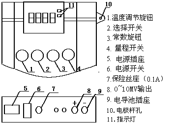 例如,電極常數為0.85,調“常數”鈕使顯示850。常數為1.1,則調“常數”鈕使顯示1100(不必管小數點位置)。